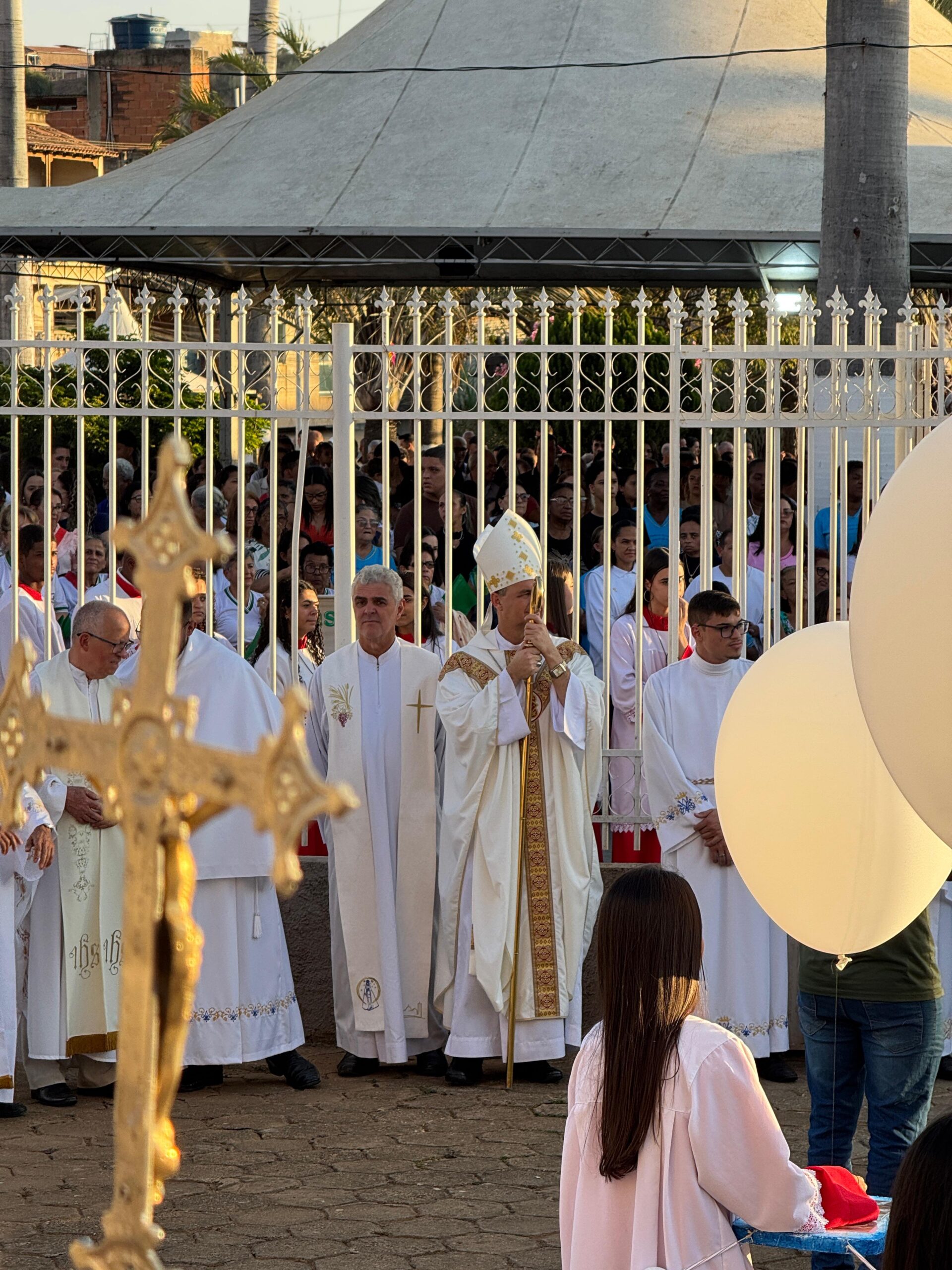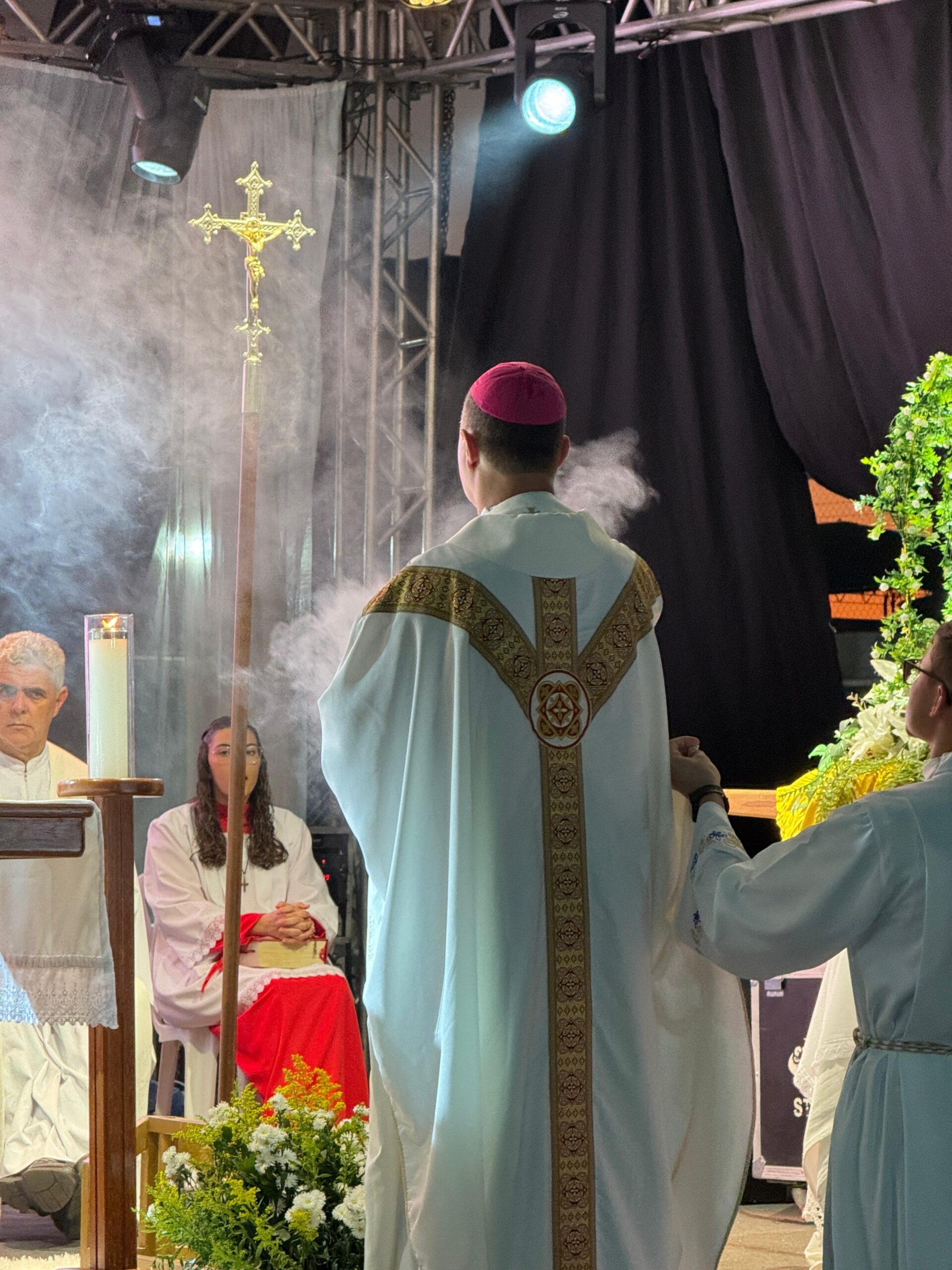 A celebração Eucarística foi presidida por Dom Juarez Delorto Secco nosso Bispo Diocesano e concelebrada pelo pároco Pe. Raniel, o vigário Pe. Turíbio e pelos padres filhos desta paróquia Pe. José Geraldo (Arquidiocese de Vitória – E.S.) e Padre Agentil (Diocese de Aparecida – S.P.).