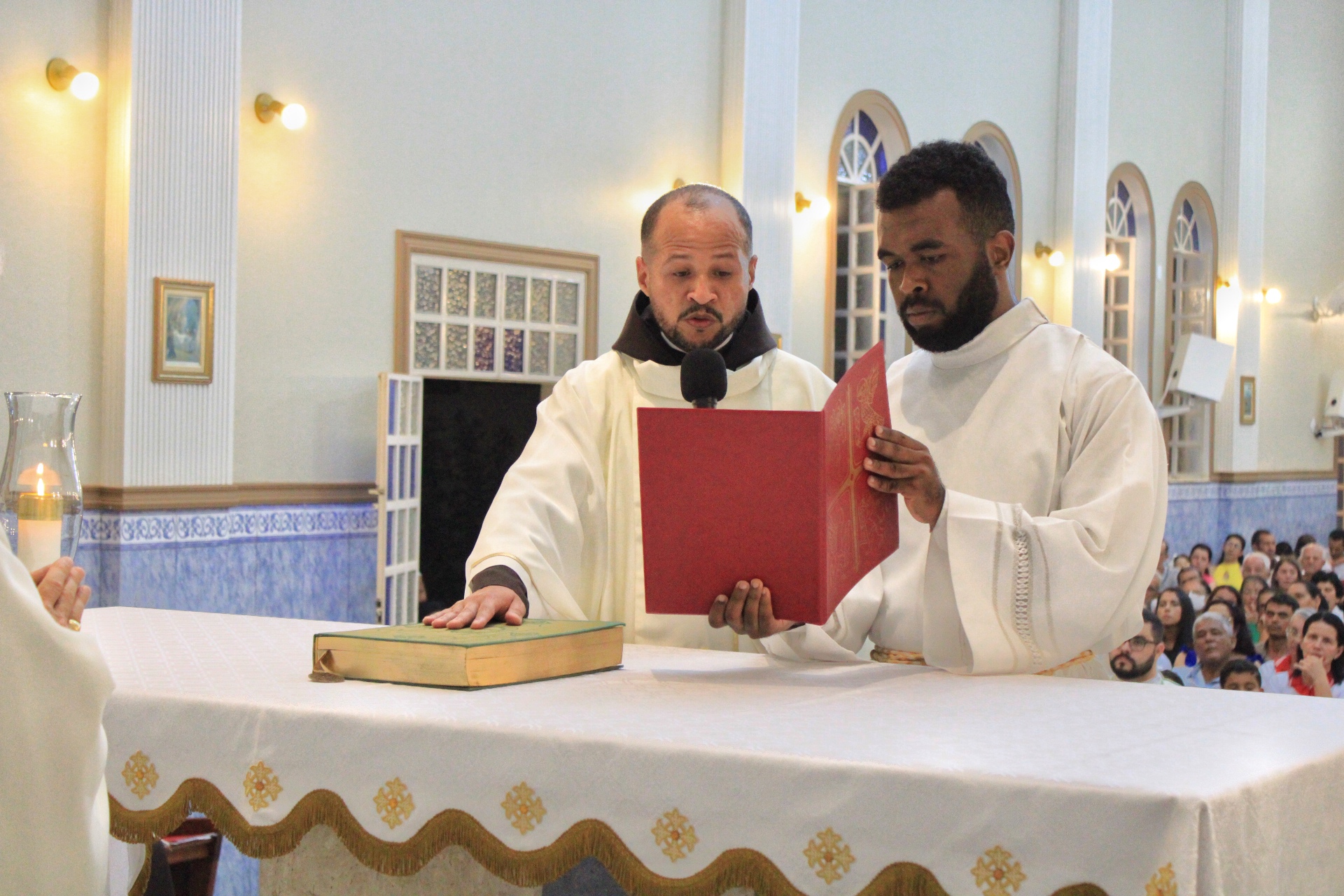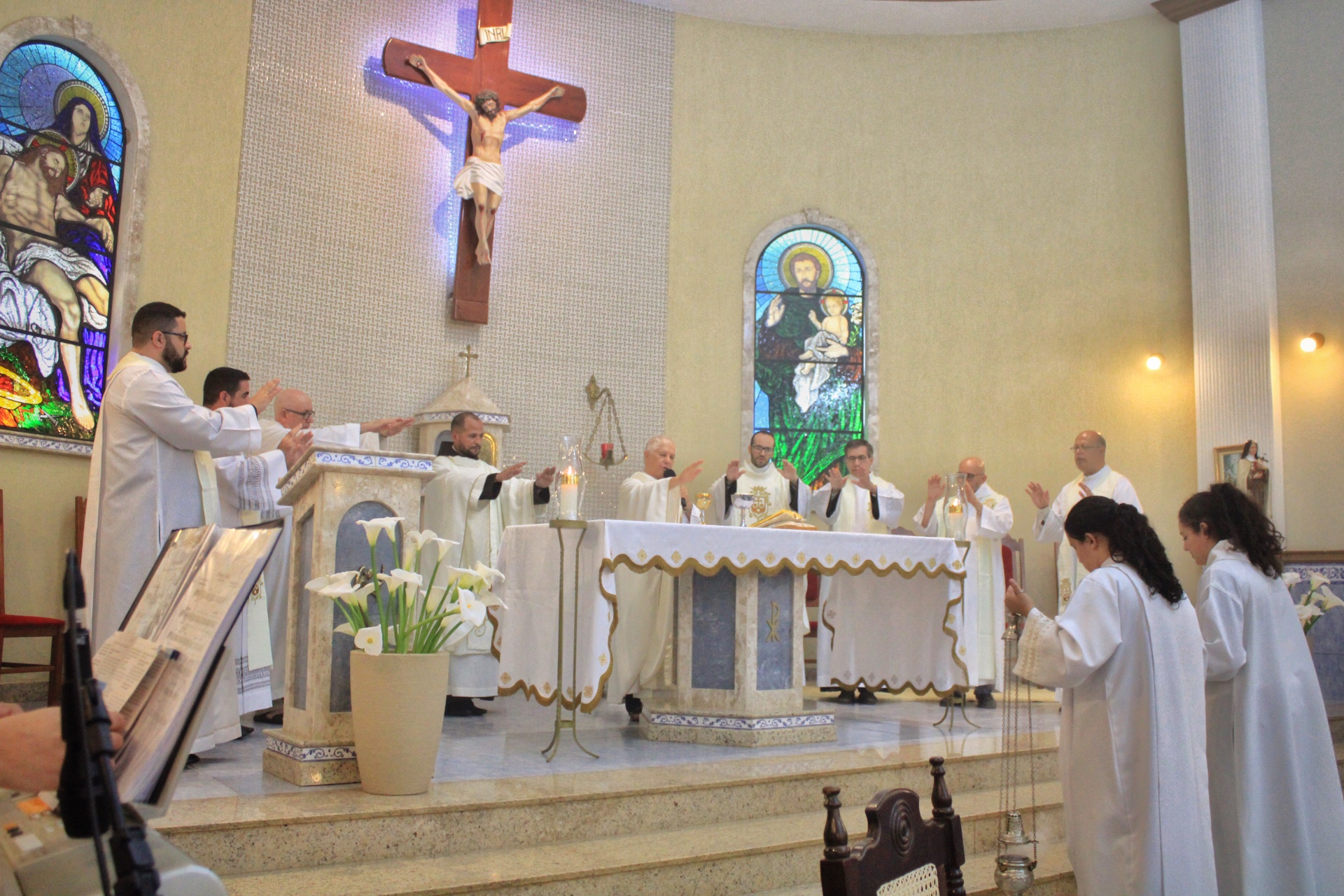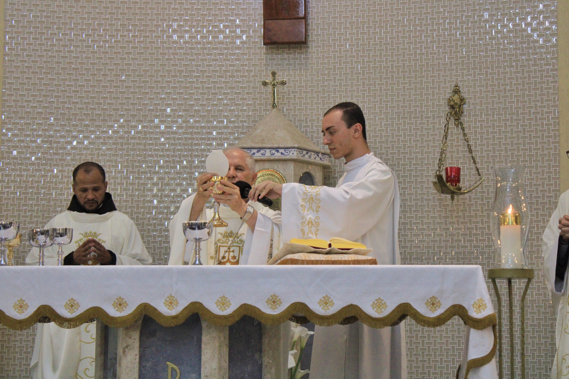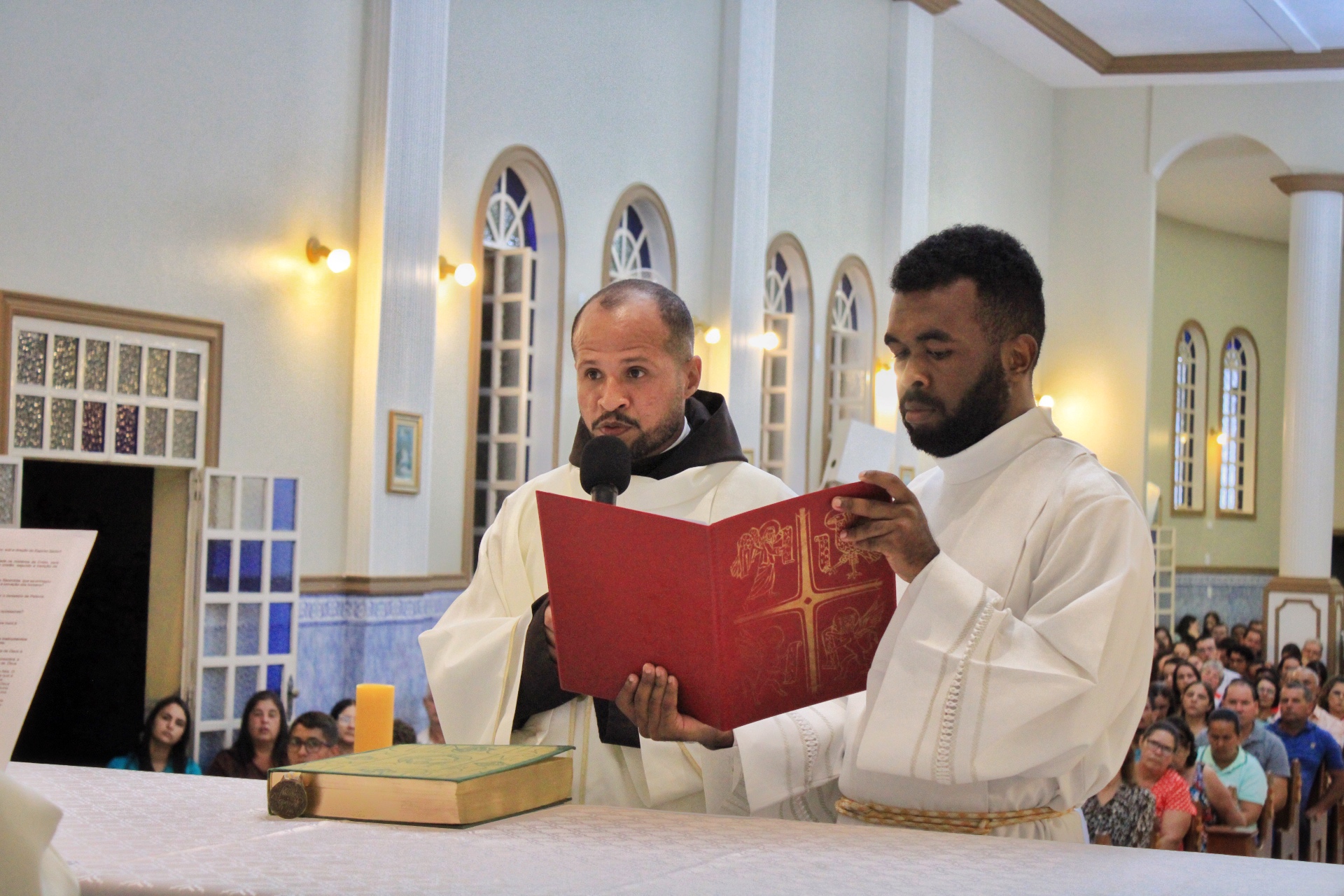 A Eucaristia foi presidida por Dom Emanuel Messias de Oliveira, bispo diocesano de Caratinga, e além da presença dos 4 frades que irão trabalhar na paróquia, foi ainda concelebrada por Frei Rafael Terra (Pároco Nomeado da Paróquia do Carmo em Caratinga), Frei Geraldo Afonso (Novo Superior do Convento de São Paulo), Pe. Ademilson Quirino (Diretor Espiritual do Seminário Diocesano) e Pe. Dione Leandro (Pároco de Bom Jesus do Galho e Vigário Forâneo de Caratinga). A Celebração contou ainda com a presença dos seminaristas Emanuel, Victor e Phillipi, ambos da etapa da Teologia do Seminário Diocesano.