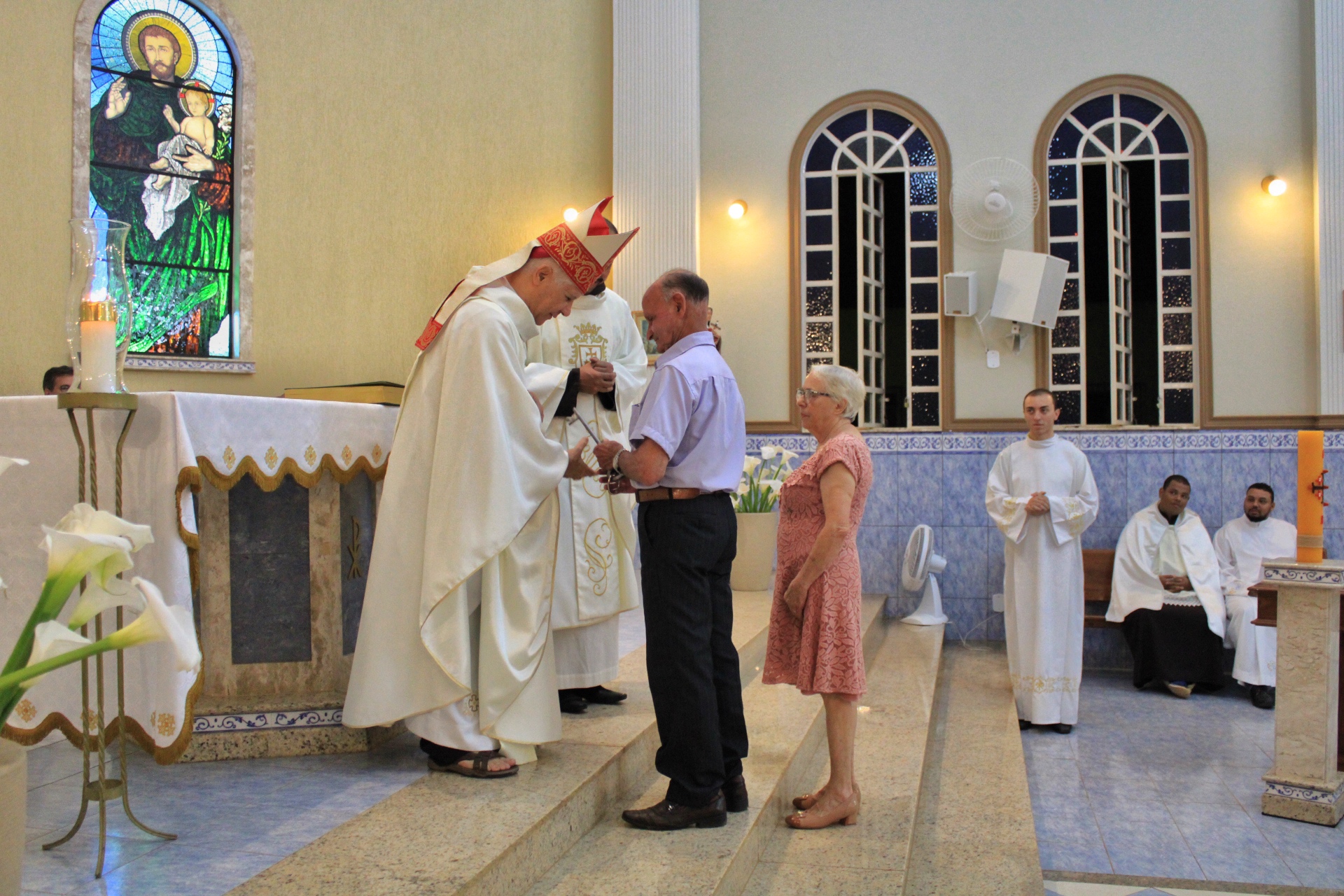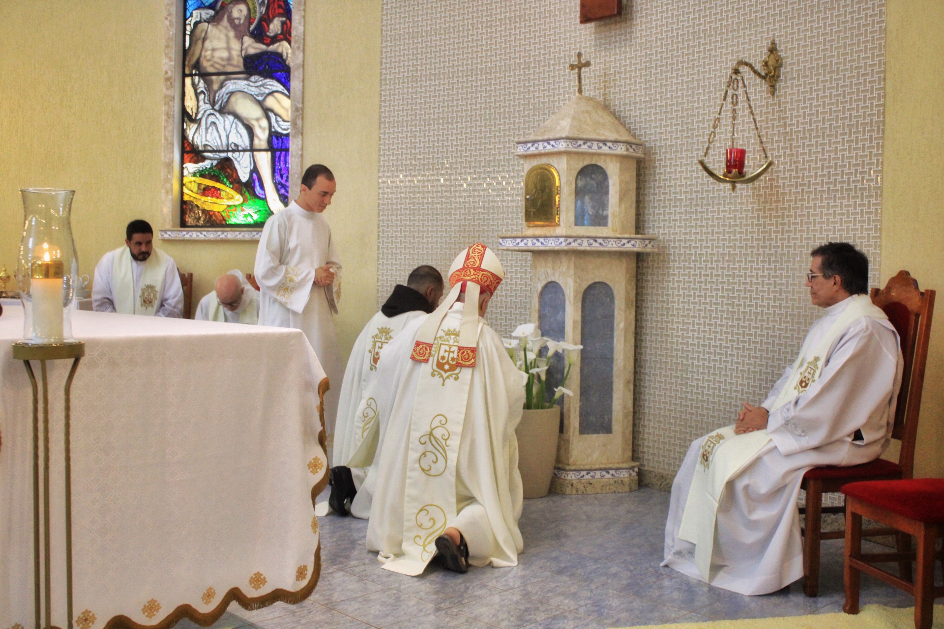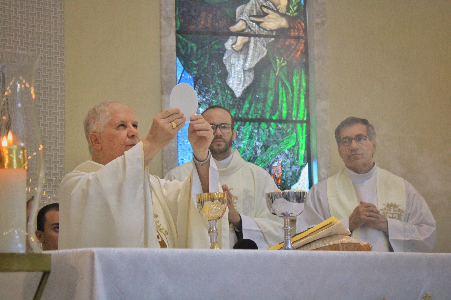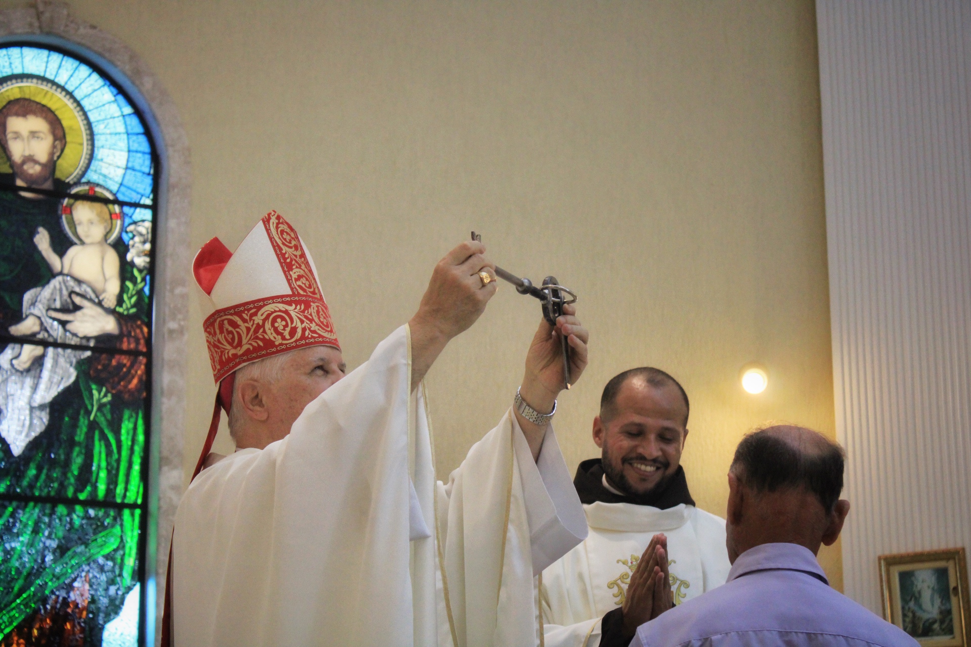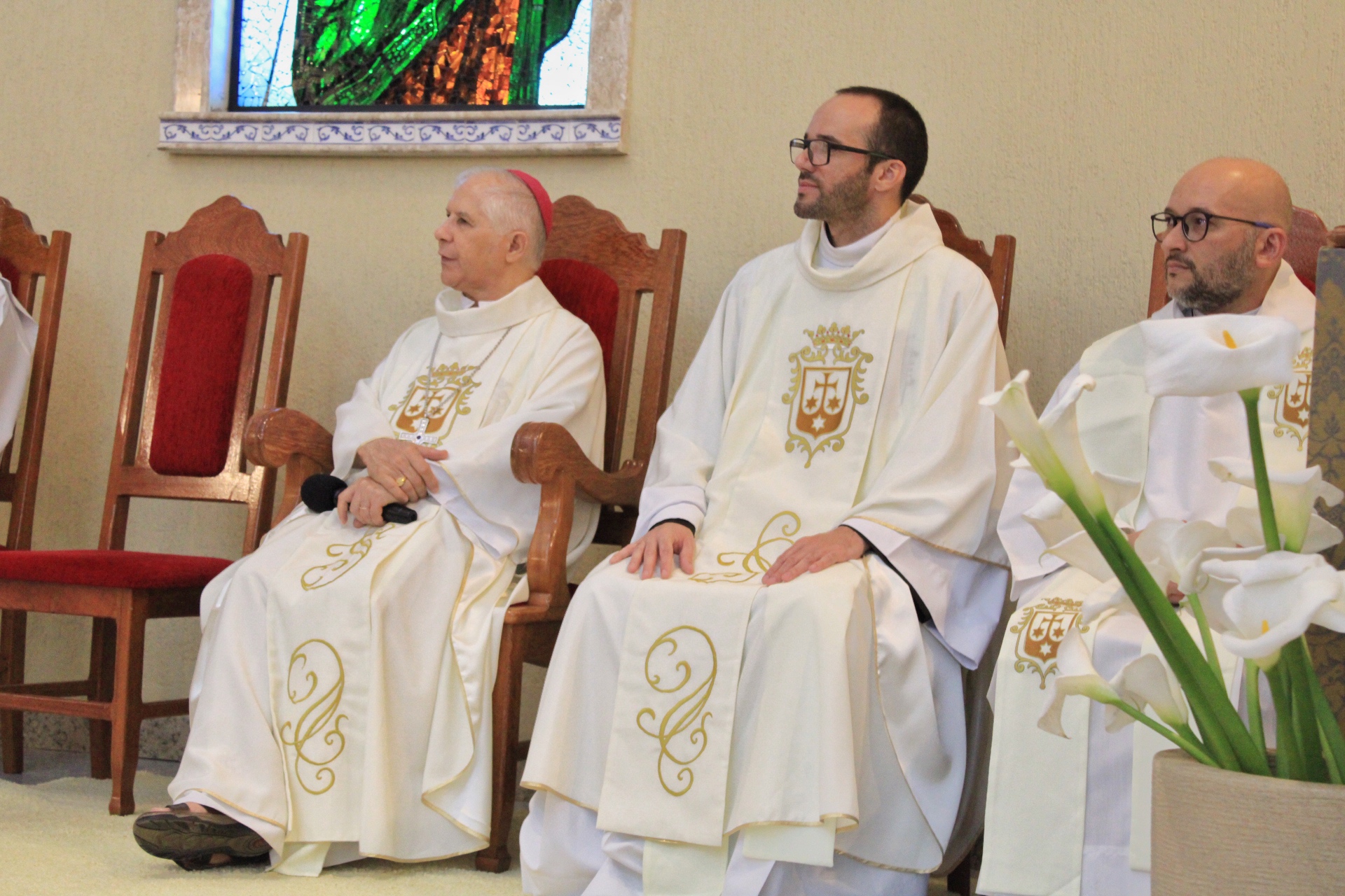 A Eucaristia foi presidida por Dom Emanuel Messias de Oliveira, bispo diocesano de Caratinga, e além da presença dos 4 frades que irão trabalhar na paróquia, foi ainda concelebrada por Frei Rafael Terra (Pároco Nomeado da Paróquia do Carmo em Caratinga), Frei Geraldo Afonso (Novo Superior do Convento de São Paulo), Pe. Ademilson Quirino (Diretor Espiritual do Seminário Diocesano) e Pe. Dione Leandro (Pároco de Bom Jesus do Galho e Vigário Forâneo de Caratinga). A Celebração contou ainda com a presença dos seminaristas Emanuel, Victor e Phillipi, ambos da etapa da Teologia do Seminário Diocesano.