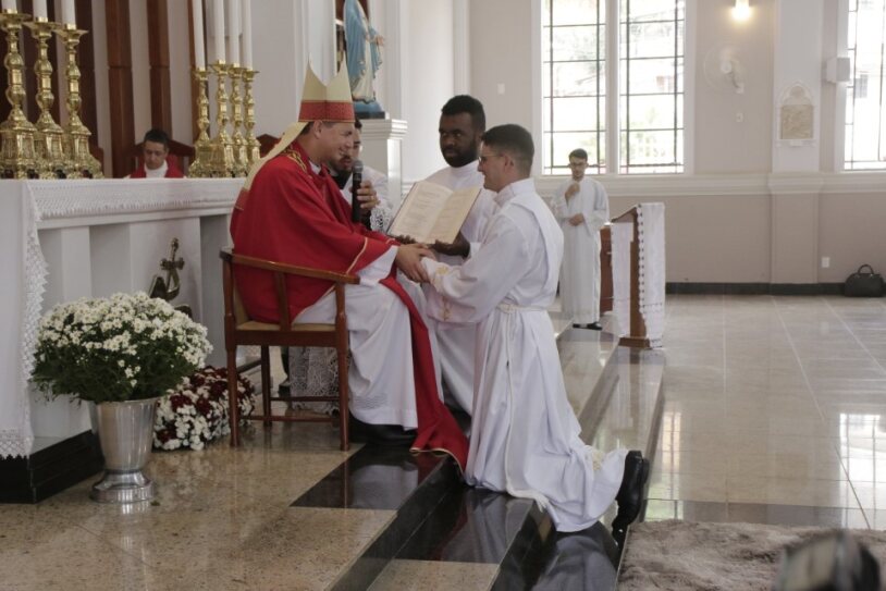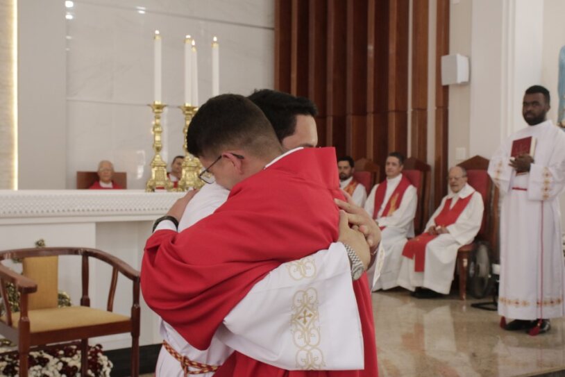 Já ordenado, o novo diáconos recebeu as veste litúrgica e os Santo Evangelho, assumindo, mais uma vez, a missão de anunciar e testemunhar os ensinamentos de Jesus. Em seguida, ele foi cumprimentado pelo bispo com um abraço de paz e acolhido ao presbitério.
