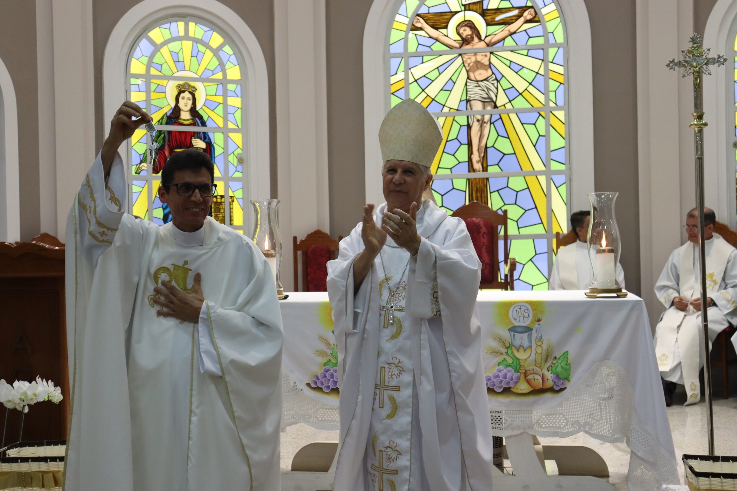 Seguindo os tradicionais ritos, o sacerdote recebeu a chave da igreja, juntamente com alguns outros símbolos importantes para a caminhada pastoral como a chave do sacrário, a concha do batismo e a estola roxa, representando o Sacramento da Penitência.