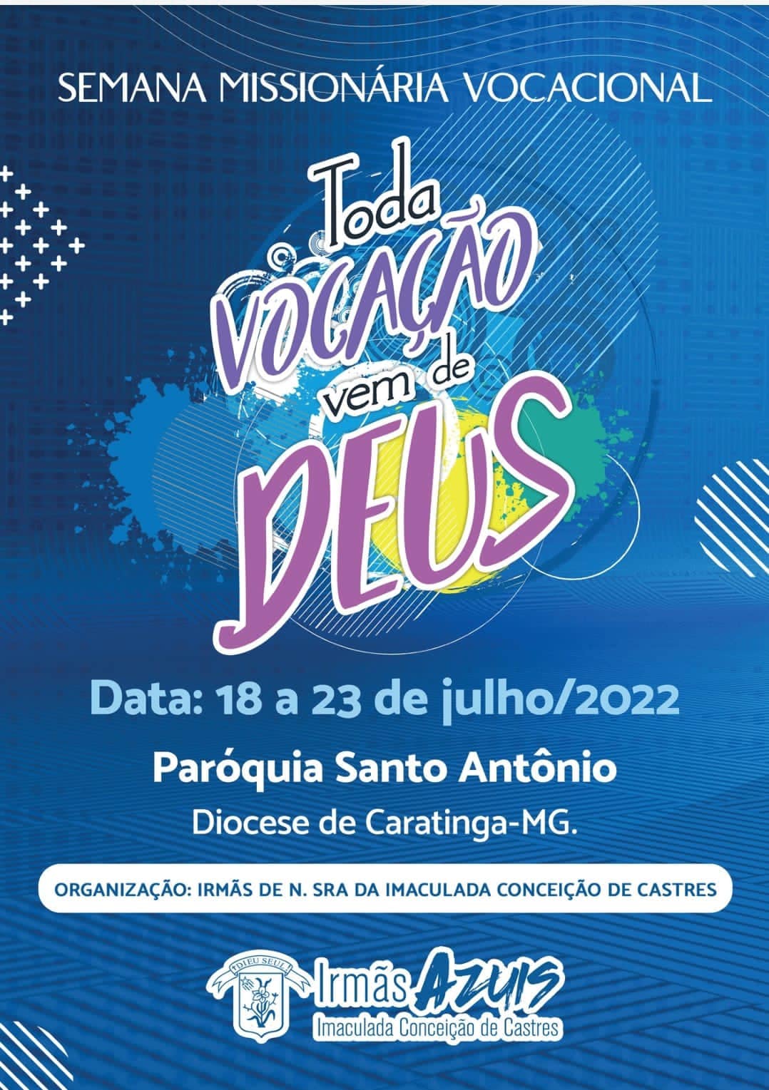 Passados dois anos da nossa última semana Missionária Azul, com alegria chegamos para anunciar a boa notícia de 2022! Uma nova missão nos aguarda na Diocese de Caratinga-MG, na paróquia Santo Antônio. Assim com alegria as Irmãs Azuis receberam o comunicado de uma nova Semana Missionária Vocacional.
